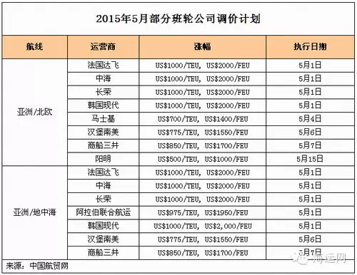 近日,更多航运公司加入5月亚欧线涨价计划,涨幅在800~1000美元间。